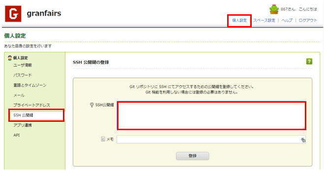 登録は簡単。Backlogにログインして「個人設定>SSH公開鍵」から登録画面を開きます。