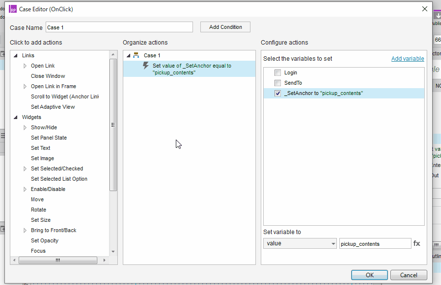 Set variable to を左から以下の内容に設定 ①「value」・・・ここでは変数値を設定したいので「値」という意味の value を選択 ②「pickup_contents」・・・ステップ1で設定した値を入れる 真ん中ブロック Case 1 の下に Set value of SetAnchor equal to “pickup_contents” と追加されたことが確認できる。 |
